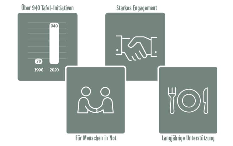 Seit 2009 unterstützt REWE die Tafeln mit der jährlichen Tafeltüten-Aktion „Gemeinsam Teller füllen!“ Allein 2019 spendeten der Konzern gemeinsam mit Kunden 500.000 Tüten haltbare Lebensmittel im Wert von 2,42 Millionen Euro. Auch für benachteiligte Kinder setzt sich die REWE Group gemeinsam mit den Tafeln und anderen Partnern ein. Im Rahmen der Aktion „Powerkiste“ wurden seit 2009 mehr als 1,6 Millionen Frühstücke an Schulkinder verteilt.
